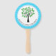 Family reunion hand fans with a family tree and black text fields for your family reunion information and a blue and white lattice pattern background.