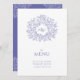 purple blue and white wedding dinner menu. Edit this 4 course menu with your own meal option wording. Simple yet modern hand drawn leaves and monogram design. © Original hand botanical drawing and design by Sarah Trett for www.mylittleedenweddings.com exclusively on zazzle.