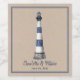 Designer Maura A. © for Sly Coconut Creative Designs. An elegant design featuring a one of a kind hand drawn lighthouse in a blue and white colour theme. The light kraft background texture is an image and is optional. The couple's name is in a modern brush script and date in a modern font. Fonts and their colours are customizable.