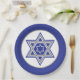 Hanukkah themed paper plate. Classic Hanukkah blue background with an image of a multi-layered Star of David in a white circle. Size is optional, so although this shows a large dinner plate, you can swap it out for the smaller size if you choose.