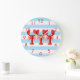 Classic light blue pastel and white nautical horizontal stripes. With three red lobsters as decor. Red clock face numbers.