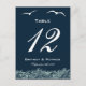 Blue & White Nautical Wedding Table Number Cards--feature a navy blue print with a design of white birds and ocean waves at the bottom. Matching wedding invitation suite found below. Use the personalize feature to the right to customize each table number card to your own details then add to cart. Return to this page & repeat for each table number card that you need.
