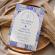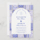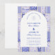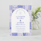 A timeless blue and white design inspired by classic Delft porcelain and French toile patterns. The patchwork tile border combines delicate florals, stripes, and ornamental motifs that evoke vintage European ceramics. A soft arched panel in the centre keeps the layout refined and elegant while allowing the details of the porcelain-inspired pattern to frame the celebration beautifully. Perfect for couples planning a sophisticated blue and white wedding with traditional European charm.