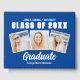 This trendy blue custom senior senior portrait photo collage graduation guest book features white varsity letters for the Class of 2025 under your college or high school name. Customize with your favourite 3 graduate photographs for your party.