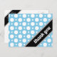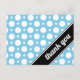 Thank you postcards with an assorted polka dot pattern with alternating sizes of white circles over a cafe-style blue. "thank you" is printed diagonally in white on the front over a diagonal black stripe across the lower right corner. The backside is custom printed with your own text, or may be easily left blank handwriting your own sentiments of thanks. This style and colour scheme make these cards an appropriate choice for Bridal Showers, Baby Showers, and Birthdays, or any occasion for saying thanks. Bulk discounts apply. No minimum order.