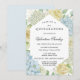 Elegant choice for a summer or spring Quinceanera celebration. This chic floral design features ivory roses and blue and white hydrangeas. Together they form a modern geometric hexagon frame around your Quinceanera details.