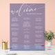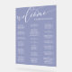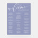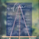 Acrylic seating chart printed transparent blue with welcome in a swirly script and the seating chart in an elegant font. Works for any event. Seating chart sign printed on acrylic with a blue-tinted background and white text. Welcome is printed at the top and you can add three columns of guests, sorted alphabetically so they can easily find to which table they're assigned. Blue transparent acrylic seating chart sign for any event with white fonts.