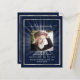 An elegant 2-page program. A dark blue background, a faux silver looking frame, and space for a photo. Light beams behind the photo. Personalize and add name, dates and your text.