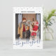 Double sided Christmas photo card with a large photo of your family with Merry Christmas written beneath small blue stars, and your last name written across the lower part of the holiday card in a blue script. On the back, add another photo and a Christmas greeting!