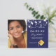 On front: Add your own vertical size photo of the graduate. A classic navy blue background color, decorated with white stars. Personalize and add a name and date. White letters. The name and the text: Save the Date are written with a modern hand lettered style script.