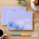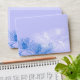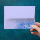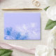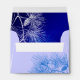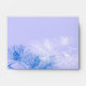 A custom return address A6 envelope with blue letters on the back flap, a blue and white pine pattern on the outside, and an inside lining of elegant pine boughs and pine cones in blue and white on an icy background of blues and violet.