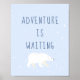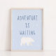 Cute blue winter snow with feature quote " Adventure is waiting ", nature explore and adventure polar bear perfect for kids nursery, children's room, bedroom, playroom and other room. personalized text and monogram and background colour. Gender neutral design for both boys and girls.