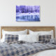 This fine art wrapped canvas print presents a seasonal winter landscape in shades of blue, violet, grey, white and purple. The trees are bare. Ice covers part of the water but lovely reflections of trees, clouds and sky shine through. Snow surrounds the pond.