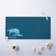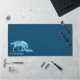 A stylized blue wolf (Canis lupus) casts a shadow as it passes through snowy terrain. Customize by adding your own text.