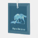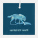 A stylized blue wolf (Canis lupus) casts a shadow as it passes through snowy terrain. Customizable text reading, "Merry Christmas" also appears.