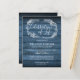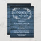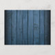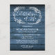 A rustic celebration of life remembrance invitation postcard featuring a hand-drawn foliage garland on a blue wood panels background. Designed by Thisisnotme©