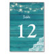 Dress up your wedding or party tables with this blue wood, lace, string lights Table Number Card.