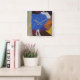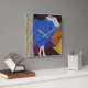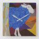 This painting is an interesting combination of minimalism, figurative art and abstract design. The tree bark and the pattern and design of the surrounding fields contrast with the classic sheep, but with a twist as he is blue and covered in curly wool patterns. It's as if she's about to go on a trip, but at the same time enjoying enjoying her perfect position behind a tree.