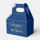 Dark blue and yellow world map round wedding favour box for a destination wedding.