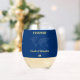 Blue and yellow passport destination wedding wine glass with world map. Personalize it with your name. Also great for a pilot, a vacation or a frequent traveller.