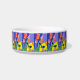 This is a heavy, durable bowl decorated with Tibbies of many colors, the perfect size for hungry/thirsty Tibs. The design is interesting and printing clear.