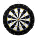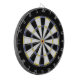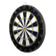 This dartboard is decorated with the colours Blue, Yellow, and Black.