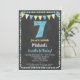A funky chalkboard blue and yellow 7th birthday invitation featuring chunky chalk text at the top with chalkboard background, flags and a cute polka-dot border.