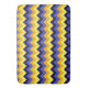 A large sized bath mat featuring a cute, ombre pattern design of chevrons in blue, yellow and gold.