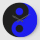 A blue yin yang design on a clock face. You can choose customize this design by changing the background colour.