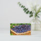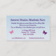 This business card presents the Summer Meadow Blueberry Farm. A woven basket overflowing with blueberries is on the front. The back has all the important text a well as pink and purple butterflies. All text can be customized to fit your individual business.