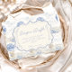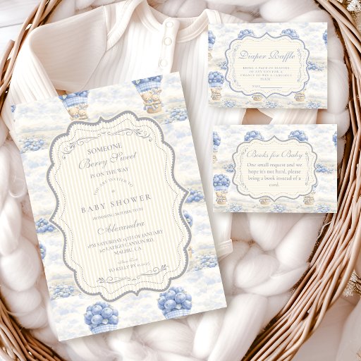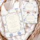 A sweet vintage-inspired design featuring delicate blue bows, soft striped detailing, and charming blueberry garden illustrations. Toile-style artwork with adorable animals and fruit baskets creates a classic storybook feel in a soft powder blue palette. The ornate central frame adds elegance while keeping the overall look light, refined, and timeless. Perfect for a baby shower with a gentle garden theme and a touch of traditional charm.