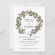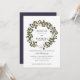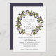 Elegant leaf and Blueberry inspired wedding invitation design featuring a delicate wreath of foliage and stems with Blueberry and raspberry fruits on white background.
