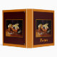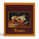 This recipe binder features mouth-watering blueberry muffins arranged on a shiny glass plate on a wooden table backed by a draping of deep purple fabric. The image is framed in shades of butterscotch, gold and brown and is repeated on the back. The text can be customized or removed.