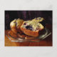 This postcard features mouth-watering blueberry muffins arranged on a shiny glass plate on a wooden table. The background is draped in a deep purple fabric.