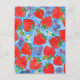 A bright and colourful post card featuring a pattern of bright red strawberries, blueberries, bees and white flowers drawn in pen and ink with watercolor with a sky blue watercolor background. This design is from my colouring book called "Lila's Garden: A Cottage Garden Colouring Book" that can be found on Amazon. You can find it on several other nice items in my Zazzle shop too!