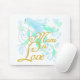 Pretty blue bird, hearts, flowers, and ribbon design of blue and mint green with golden text that reads "Mom is Love" on mom T-shirts, tote bags, mousepads, magnets, and other mom gifts and apparel.