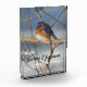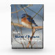 Pretty little bluebird wintering over resting on a branch against a backdrop of snow with the inspirational words May the bluebird of happiness always reside within you. Nature photography by Susan.
