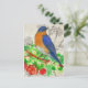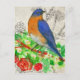 A collage art post card decorated with a bluebird perched on a tree branch blooming with white flowers accented with red roses and tree branches drawn in black pen and ink on a damask style French script background.