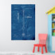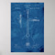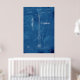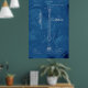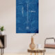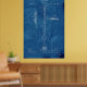 A technical patent diagram of an invention for a certain guitar dated 1888 which has been designed for wall art on a blueprint background.