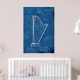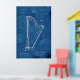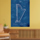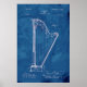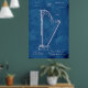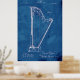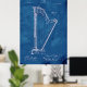 A technical patent diagram of an invention for a new style of harp dated 1899 which has been designed for wall art on a blueprint background.