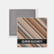 This magnet design features a blurry striped pattern inspired by rustic colours like shades of brown, grey, and beige. It also features a personalized name.