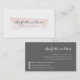 Elegant blush and grey business cards feature your name or business name on a blush pink watercolor swash background, with your full contact details on the back in white on grey.