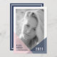 Our modern and trendy graduation photo announcement or party invitation features your portrait oriented photo on the front, with the graduate's name, school and graduation year. A thick white border and colorblock detail in transparent blush pink and navy blue adds a geometric and trendy look to your senior portrait. Add your party details to the back in a crisp block typography in chic navy and white; or, clear the back text to use as a simple graduation announcement.