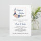 These trendy and stylish couples wedding shower invitations feature hand drawn flowers in navy blue and blush pink watercolors. Plenty of botanical green leaves and foliage decorate the bouquets. There is also a faux rose gold look rectangular geometric frame and modern handwritten script.
