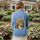 The Blush Blooms & Bunny Dreams jean jacket features a gentle tan and white watercolor bunny nestled among pastel pink flowers and lush green leaves, adding a delicate and heartwarming touch to your spring wardrobe.
