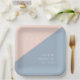These dusty blue and blush pink minimalist, elegant, monogrammed wedding paper plates can be personalized with your information in modern typography. Designed by Thisisnotme©