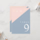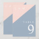 These dusty blue and blush pink minimalist, elegant wedding table numbers can be personalized with your information in modern typography. Designed by Thisisnotme©
