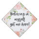 This Blush Floral and Script Inspiration Message Graduation Cap Topper is the perfect way to let the graduate stand out at his or her graduation ceremony. This design features a Blush Floral and Script Inspiration Message. Believing in myself got me here is featured in black script font on the centre of the cap topper. Graduation is a special day and this cap topper will make the day even more special. Use cap topper as a great photo prop or a keep sake from the special day.