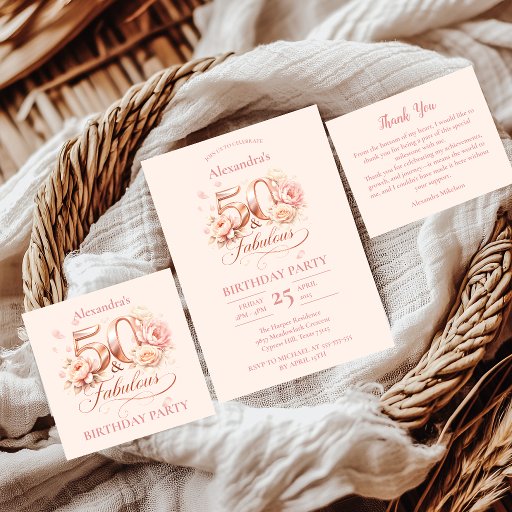 Celebrate a beautiful milestone with this soft and feminine blush floral design, featuring delicate roses and elegant typography. The warm neutral tones combined with subtle floral accents create a romantic, refined look perfect for a stylish 50th birthday celebration. Ideal for garden parties, intimate gatherings, or elegant indoor events, this design brings a gentle, timeless charm that feels both modern and classic. A lovely choice for those who want a graceful and sophisticated celebration aesthetic.