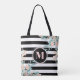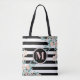 Blush Floral on Black and White Stripe Monogram Tote Bag